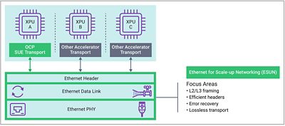 AI pods have changed the rules of networking. Inside a rack, accelerators must share data with sub microsecond latency and deterministic performance while keeping tail latency in check. The industry is aligning behind open, Ethernet based approaches that deliver scaleup performance without vendor lock, most notably: ESUN (an OCP workstream), SUE (an OCP published framework), and UALink (a consortium standard for memory semantics).