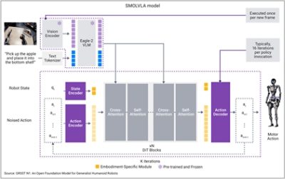 VLA workloads also introduce strict performance requirements of Physical AI models. Robotic control loops commonly operate at frequencies between 10 and 100 Hz, leaving only a few milliseconds for perception, reasoning, and action decoding. Models such as SMOLVLA illustrate the complexity of this workload: each frame may require more than a dozen iterative inference cycles to generate a stable action trajectory.