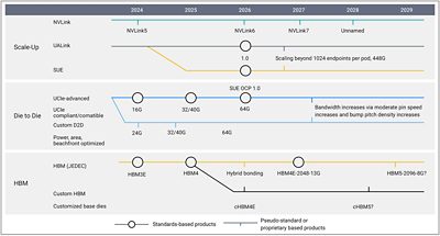 Interface ecosystems are evolving along multiple parallel paths. In scale‑up fabrics, standards‑based such as UALink, ESUN and SUE, and proprietary approaches are advancing simultaneously to optimize per-wire bandwidth while providing critical memory awareness concepts easing compute expansion. Die‑to‑die connectivity continues to develop along both open and custom‑optimized lines to exceed reticle limitations and essentially utilize many heterogeneous and homogeneous dies as a single compute engine while expanding the number of lanes physically possible on a single die for added system bandwidth. Memory interfaces are similarly diversifying with the emergence of customized HBM variants alongside JEDEC standards to enable parallel links for KV cache bandwidth needs. Increasing bandwidths for the leading standards PCIe & CXL links off the host CPUs and associated infrastructure are driving next generation standards from 3 year to 2 year development cycles.