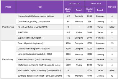Modern AI training spans a wide range of behaviors. Compute-bound, memory-bound, and network-bound constraints need to be understood to optimize today’s workload bottlenecks. Post‑training workflows such as reinforcement learning, preference optimization, and fine‑tuning introduce highly variable stress profiles. Pre‑training has expanded beyond dense models to include long‑context training, multimodal inputs, Mixture‑of‑Experts architectures, and simulation‑grounded world models.