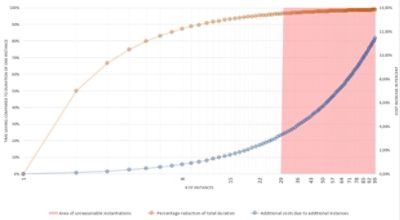 Depicted in orange is the time saved with multiple instances compared to running with a single instance. Costs (in blue) increase with each instance. The red hatching indicates the range where the additional time gained in % is lower than the additional costs in %.