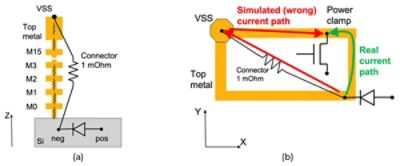 Similarly, the simulated current path from the ESD diode to power clamp differs from the real current path, as shown in Figure 6. The current follows the path of minimum resistance (minimum dissipated power) from the ESD diode to the power net port, then flows along the (low-resistive) top metal and down to the power clamp. Because of this, simulated resistance and current densities are incorrect and do not represent the real resistance and current density.