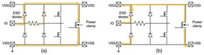 Figure 1. (a) ESD current paths, and (b) P2P resistances (red arrows) in ESD protection network. Resistances between pads and ESD diodes, diodes to power clamps, and other resistances are calculated to verify robustness and quality of ESD protection.