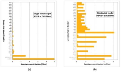 Furthermore, when trying to determine which layers are causing problems, these two simulation conditions report different rankings of layer contributions to the total P2P resistance. Simulations with single discrete instance pins may lead to a completely wrong layer optimization strategy by focusing on the wrong layers.