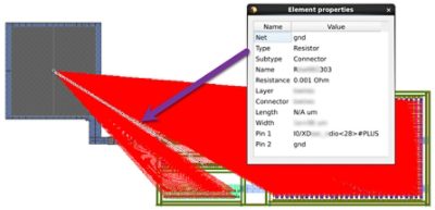 Figure 5. Visualization of parasitics over layout, helping identify connectivity, nonphysical connector resistors, and probe parasitics