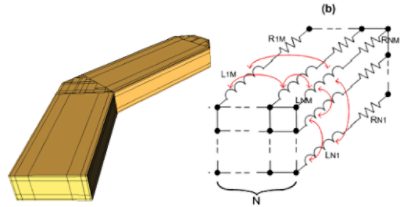 A section of semiconductor interconnect with its extracted electromagnetic model, including full inductive coupling. The finite element mesh is created automatically to represent the physical layout for the simulator.