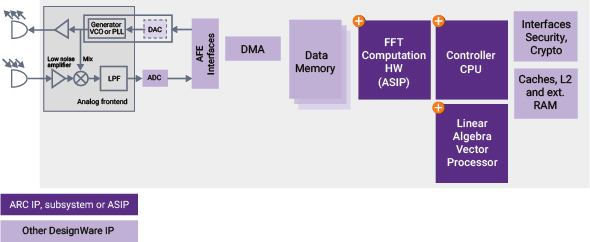 Automotive advanced driver assist systems (ADAS), use multiple technologies to gain 360 degree awareness of surroundings. RADAR offers visibility in poor lighting and weather conditions, and is used for ADAS front collision avoidance, pedestrian detection, adaptive cruise control and emergency braking. ARC HS4xD and EV6x processors offer the range of processing to meet vector signal processing demands. Synopsys’ ASIP Designer tool offers developers the ability to create high-performance processors for front end FFT processing.