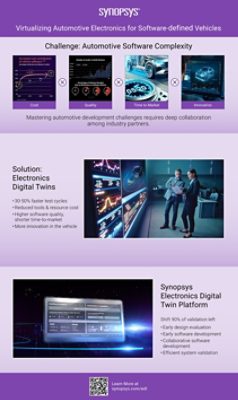 2026年3月10日 カリフォルニア州サニーベール発–シノプシス(Synopsys, Inc. NASDAQ上場コード: SNPS)は本日、シノプシス Electronics Digital Twin Platform(eDTプラットフォーム)を発表した。このプラットフォームは、エレクトロニクス機器のデジタルツイン(eDT)の作成/管理/展開/利用を加速する業界初のオープン・ソリューションであり、フィジカルAIシステムを実現する先進のソフトウェア定義型製品開発に不可欠なものである。このeDTプラットフォームは、まず高付加価値の自動車用途に注力しており、OEM企業はソフトウェア開発およびシステム統合を前倒し(シフトレフト)することで、ハードウェア(チップ)が利用可能となる前に最大90%のソフトウェア検証を実現し、車両開発コストおよび市場投入までの期間を削減できる。