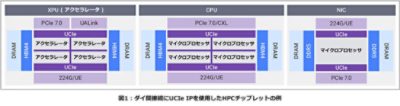 そこで、SoCの機能を「チップレット」と呼ばれる複数の小さなホモジニアス(同種)またはヘテロジニアス(異種)ダイに分割し、これらのチップレットを1つのシステム・イン・パッケージ(SiP)に統合する手法が広がりつつあります。これなら、1個のSoCではレチクル・サイズの限界を超えるような規模のシリコンをSiP全体として実現し、高まり続ける演算性能とI/O帯域幅への要求に応えることができます。IDtechExによると、チップレット市場は2035年に4,110億ドル規模に達すると予測されています。SiPには従来のパッケージ基板が使われることもありますが、配線密度の向上に有利な中間インターポーザを使用し、1個の標準パッケージまたは先進パッケージ内で機能と集積度を高めることもできます。図1に、高性能コンピューティング(HPC)分野のアプリケーションでチップレットをダイ間インターフェイスのUCIeによって相互接続した例をいくつか示します。