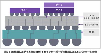 まず、マルチダイ・デザインにおけるチップレット同士のインターコネクトについて決定する必要があります。有機基板は、インターポーザ(シリコン・ブリッジを使用したものを含む)を使用した2.5次元アーキテクチャよりも低コストで、設計期間を短縮できます。しかし、より高度な用途においてインターコネクトの密度や電源/グランドおよび信号パスの要件を満たすには、中間インターポーザが必要になることがほとんどです。インターポーザを使用することが決まったら、成熟したシリコン・インターポーザ、比較的新しい有機基板RDLインターポーザ、またはシリコン・ブリッジを使用したRDLインターポーザなどから、必要なインターコネクト密度が得られるものを選択します。シリコン・インターポーザは技術的には既に確立されていますが、大型なものはコストも高く、脆いためサイズに限界があります。RDLインターポーザは、コストを抑えながら大型化を果たしており、より多くのシリコン・ダイで構成される大規模なシステム統合に向いています。いずれにしても、設計者にとっての新たな課題として、機械的フォーム・ファクタ、シグナル・インテグリティおよびパワー・インテグリティ解析、熱解析を個々のチップレットに対してだけでなく、マルチチップにおける相互作用も考慮して検討する必要があります。また、バンプ・プランニングとウェーハ・プローブ配置に関しても、チップレット、パッケージ、テストの要件をすり合わせる必要があるため複雑になります。同じ種類の基板やインターポーザでもバンプ・ピッチはさまざまで、一般的に基板の場合で110~150 µm、インターポーザ上で使用するマイクロバンプの場合25~55 µmです。図2に示すように、3D積層したダイを追加すると、ピッチの種類はさらに多くなります。