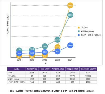 トランスフォーマーの登場によって、現在の生成AIモデルの時代が到来しました。しかし生成AIモデルのパラメータ・サイズは、CNNや多くのVision Transformer(ViT)よりも数桁大きくなります。例えば、一般的なCNNアルゴリズムで必要なパラメータは2,500万程度ですが、ChatGPTでは1,750億パラメータが必要です。この結果、NPUの演算性能とメモリー帯域幅の大きな開きが問題となってきました。図1に示すように、AIニューラル・ネットワークのワークロードに向けたGPUの性能が飛躍的に向上しているのに対し、インターコネクト帯域幅の伸びはそれほど大きくありません。