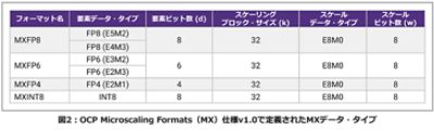 2023年にOCP Microscaling Formats(MX)仕様が発表され、3つの浮動小数点フォーマット(MXFP8、NXFP6、MXFP4)と1つの整数フォーマット(MXINT8)が導入されました。MXFP8フォーマットは、OCPの8ビット浮動小数点(OFP8)がベースとなっています。図2に、これらのデータ・タイプを示します。