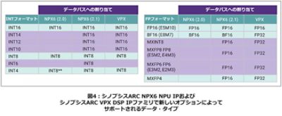 AIデータ圧縮オプションは、DMAを使用してデータ・フォーマットを高速に変換します。システム・メモリーから内部メモリーへデータを移動する際に伸張を実行し、内部メモリーからシステム・メモリーへデータを移動する際に圧縮を実行します。例えばNPX6の場合、MXFP6フォーマットをFP16フォーマットに変換して内部で処理できます。NPX6 NPU IPで実行するLLMは演算ではなく帯域幅がボトルネックとなっているため、内部演算にFP16を使用しても全体的な性能が低下することはありません。図4に、NPX6 NPU IPおよびVPX DSP IPでこれらの新しいオプションを使用した場合にサポートされるデータ・タイプを示します。これらのデータ・タイプの多くは、DMAでサポートされます。この表には、各データ・タイプがどの内部データパスに割り当てられるかを示しています。