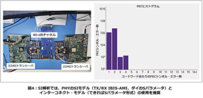 主な評価指標の1つに、前方誤り訂正(FEC)適用前のBERがあります。一般的な仕様では1E-4が基準値とされていますが、堅牢なシステム設計とするには、プロセス/電圧/温度(PVT)ばらつきを考慮したマージンが必要です。また、シミュレーションではすべてのPVTコーナーにおいてFEC適用前後のBERを比較してFECの効果を評価し、ワーストケースにおいても安定動作を確保する必要があります。