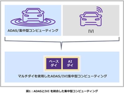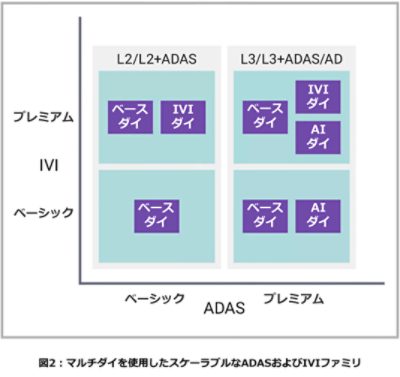 自動車業界がマルチダイ技術を導入してチップレット・ベースの半導体を設計するようになったことで、設計工数、時間、コストを最小に抑えながらOEMが求めるスケーラブルなシステムを実装できる可能性が開けています。図2に、高性能なベース・ダイとAI/IVIアクセラレータ・ダイの各チップレットを相互接続したマルチダイ・システムを示します。こうすれば、単一のハードウェア・プロセッサ・アーキテクチャおよびソフトウェア開発環境に基づいて、各種OEMプラットフォームをスケーラブルに展開できます。車載グレードのカスタム半導体向けにFinFETベースの高性能で複雑なADAS/IVIプロセッサを設計するには高度な技術力が要求され、開発コストも高騰します。しかし、I/Oデータ・チャネル、DSP、アプリケーション・ホスト処理などの複雑な機能の多くをベース・ダイに作り込み、最先端のAI処理をAI/IVIアクセラレータ・チップレットに実装すれば、コストと複雑さを最小限に抑えられます。