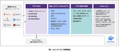 自動車業界の顧客がMLモデルの選定から開発、学習、運用までを手がけるには、包括的なソフトウェア・スイートが欠かせません。MLモデルには膨大な数が存在する上、新しいモデルの開発ペースも非常に速いため、顧客が最新かつクラス最高のモデルを利用できるようにするには、アーキテクチャの柔軟性が特に重視されます。図3に示すSiMa.ai社のPalette™ SDKを使用すると、どのようなMLモデルでも、フォーマットにかかわらずMLA上で効率よく動作するようにコンパイルできます。このSDKにより、データ・セットの精度を最大限に高めながら性能と消費電力を最適化できます。