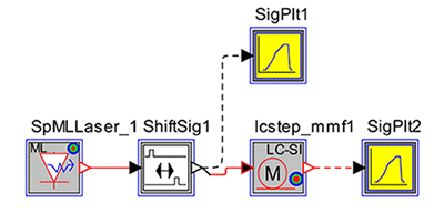 As an example, consider a large-core step-index fiber based on model parameters presented in [3] and using a similar set of launch conditions. Ref. [3] provides extracted model parameters for a 1-mm diameter ESKA-PREMIER GH4001 fiber from Mitsubishi, as well as intensity profiles at different fiber lengths for a 645-nm input signal. The following figure depicts the ModeSYS layout: