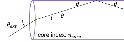 Fiber geometry showing internal propagation angle and external angle, where and is the core index (free-space launch)