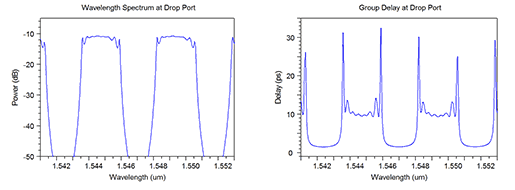 The power spectrum and the group delay plots obtained from OptSim Circuit simulations are shown in Figure 4. In this way, by combing system circuit tool and device tools, we have realized a device-level simulation for a CROW system. The simulation includes the effect of material dispersion, bending waveguide loss, and so on. The custom PDK model approach helps model larger, passive photonic devices as photonic circuits in OptSim Circuit, thereby bringing computational efficiency as compared to rigorous, device level simulations. As an example, the FDTD simulation of one of the rings in the CROW device of Figure 1 took around 16 hours to converge, while the entire PIC of Figure 4 took a few seconds to simulate in OptSim Circuit.