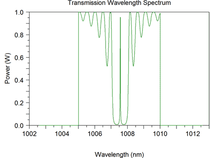 The filter with above arrangement will result in a narrow resonance due to reflections from both gratings. Traditional modeling tools for the fiber optic systems where signals are unidirectional won’t be able to model this phenomenon. On the other hand, OptSim Circuit is ideally suited for this type of modeling.