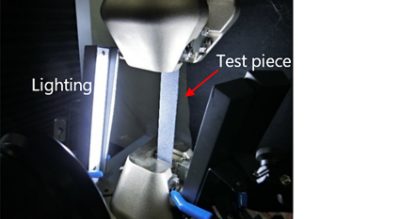 Figure 2: Scene of uniaxial tensile test of a CFRTP specimen